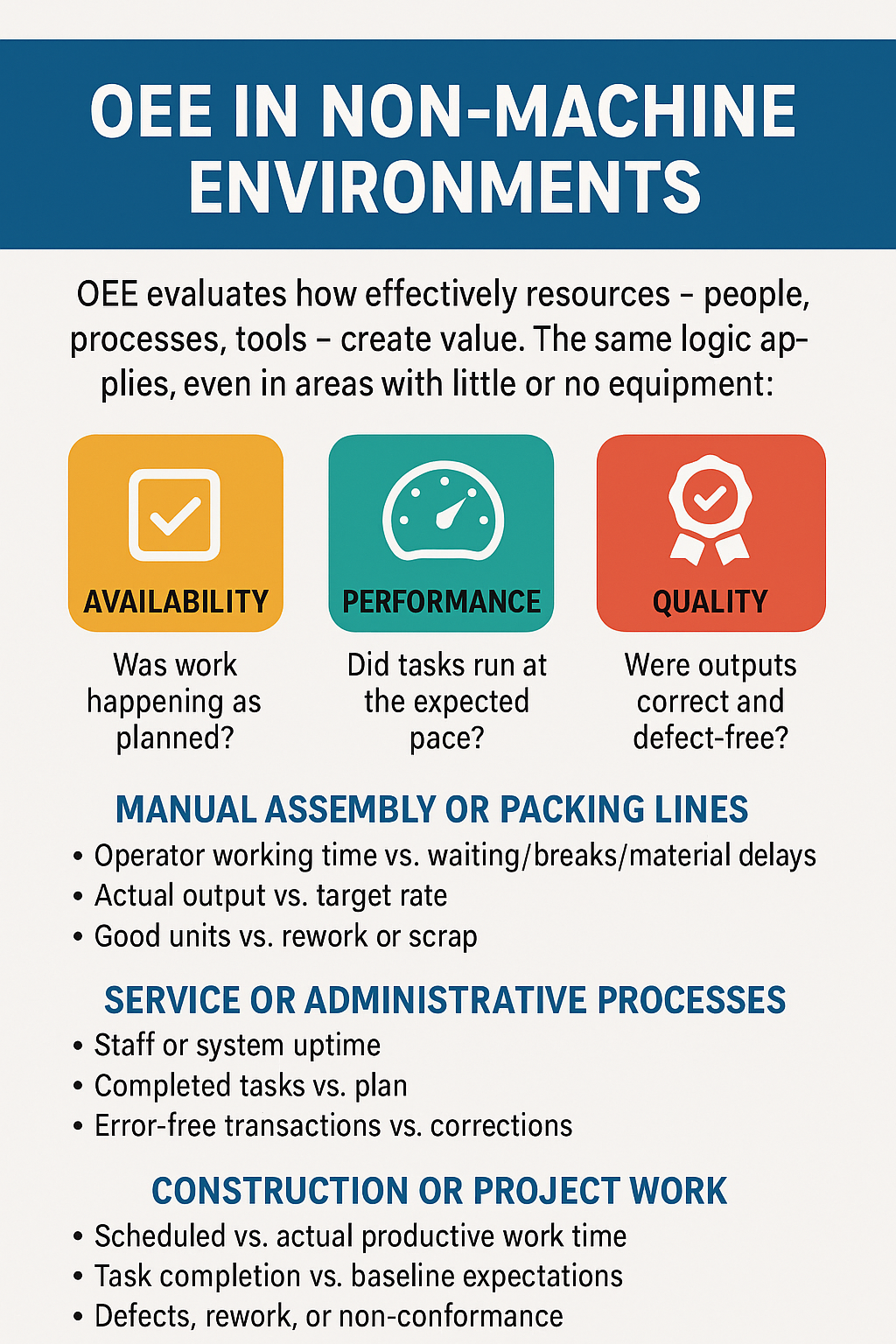 In a recent project, we successfully adapted OEE to a non-machine environment, and the results were powerful. When you step back from the term βequipment,β OEE is really about evaluating how effectively resources, people, processes, and tools deliver value.